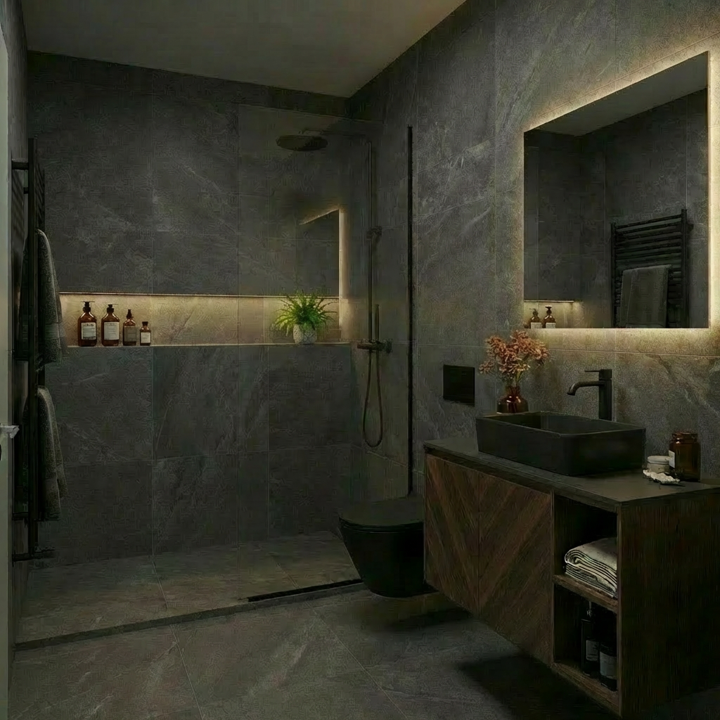 Our signature bathrooms are planned and built as complete environments, where every surface, junction, and detail works together as a unified whole.